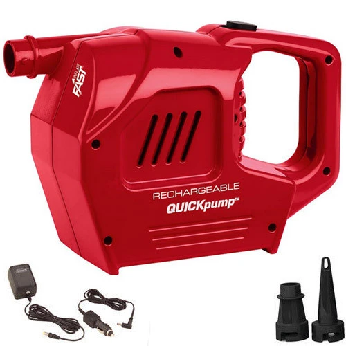 Bring your Coleman Rechargeable QuickPump Unit on your trip and inflate your air mattress at lightning speed. This handy pump inflates products that feature Coleman’s Double Lock Valves, Boston valves and with adapters (included), pinch valves. Use the 12 volt or 240 volt re-charger to re-charge your QuickPump whenever you’re near an outlet. This pump will also work with other branded inflatables.